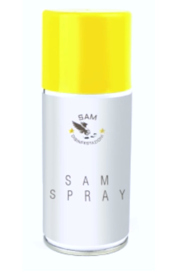E' un insetticida-acaricida aerosol a svuotamento totale a base di Piretrine pure. La presenza di Piretrine conferisce al prodotto un’elevata efficacia abbattente (knock down) contro insetti volanti e striscianti. SAM Spray elimina rapidamente mosche, scarafaggi, formiche, insetti delle derrate (Plodia interpunctella, Ephestia kuehniella), pulci e zecche presenti in: industrie in genere (comprese le industrie alimentari), silos e magazzini (in assenza di derrate alimentari), case, uffici, cantine, sottotetti, garage, ospedali, alberghi, ristoranti, mense, ambienti rurali e ricoveri per animali, negozi e mezzi di trasporto (navi, treni, autobus, containers in assenza di derrate alimentari).